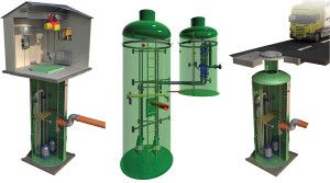 Более крупные установки монтируются за пределами дома и являются, по сути, полноценными канализационными насосными станциями. В таких станциях важную роль играет выбор приёмного резервуара – его объём должен быть не меньше четверти суточного расхода воды. В большинстве случаев полипропиленовый или стеклопластиковый бак вкапывают в землю, оставляя снаружи только канализационный люк для обслуживания и проведения профилактических работ. Работу таких систем обеспечивают один или два насоса. Использование автоматики, контролирующей уровень жидкости в баке и регулирующей работу насосов, позволяет ощутимо снизить расход электроэнергии.